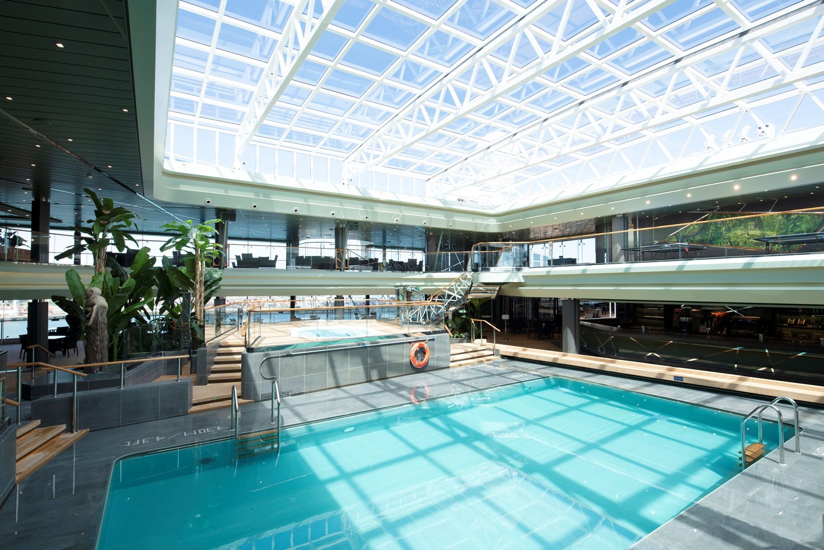 5 басейна и аква парк с водни пързалки и голяма плажна зона с шезлонги около тях на откритите палуби, СПА център с масажи и козметични процедури, фитнес с уреди от Technogym, солариум, спортна зона с игрище за баскетбол, волейбол, фитнес и тенис, симулатор на Формула 1.