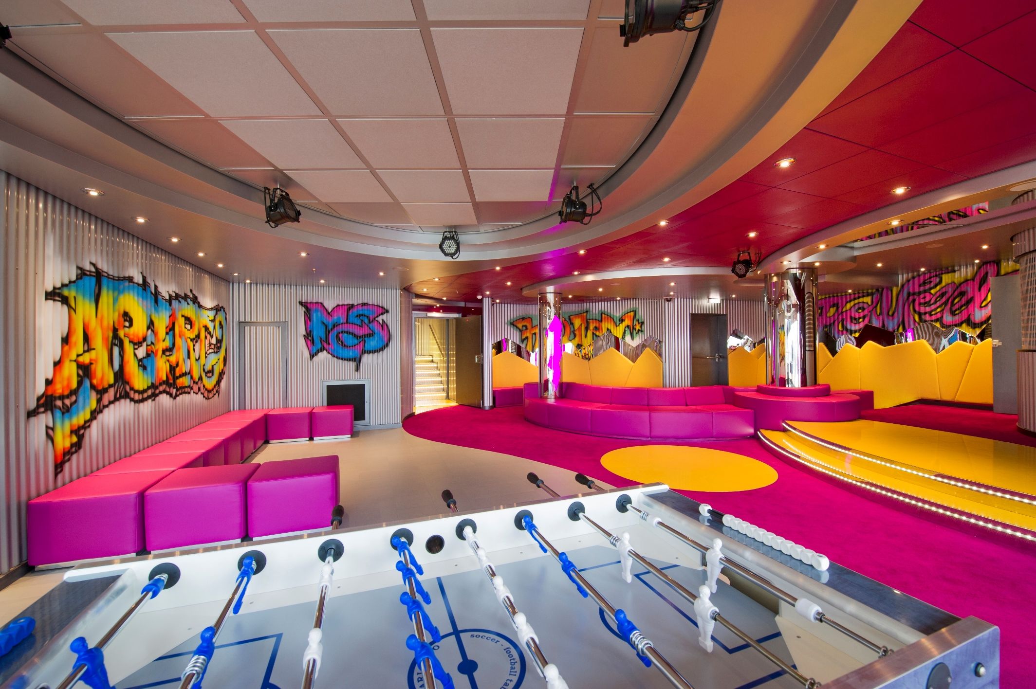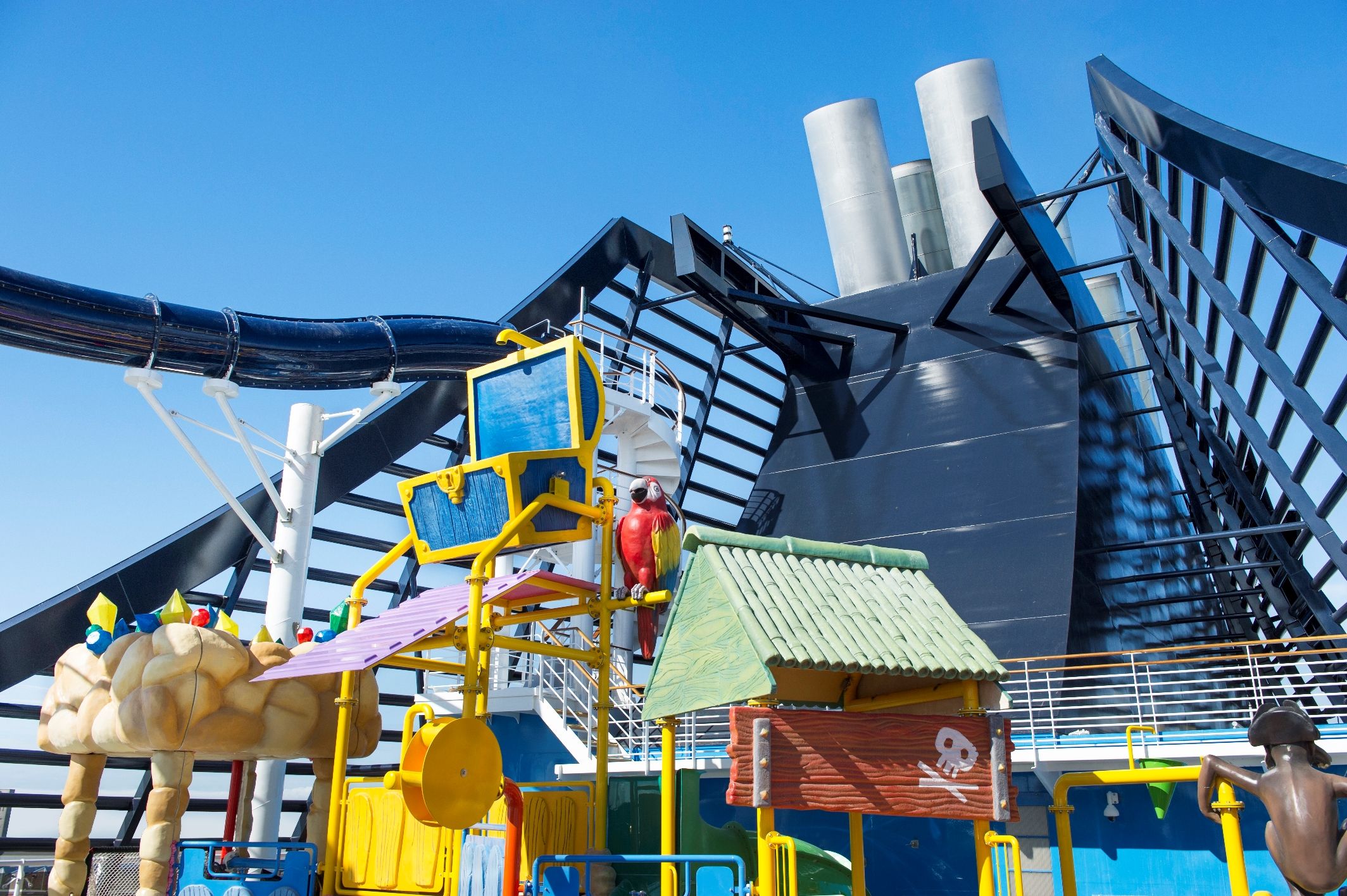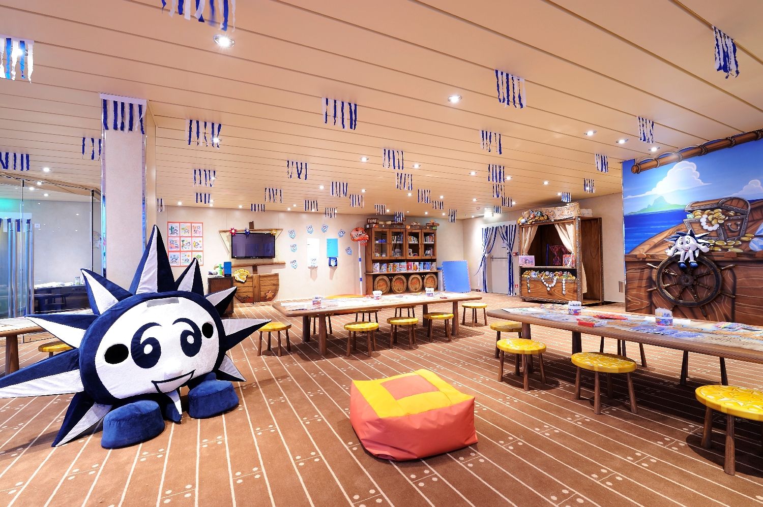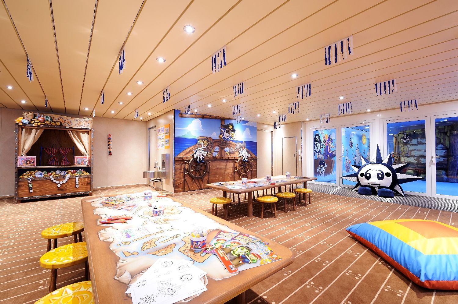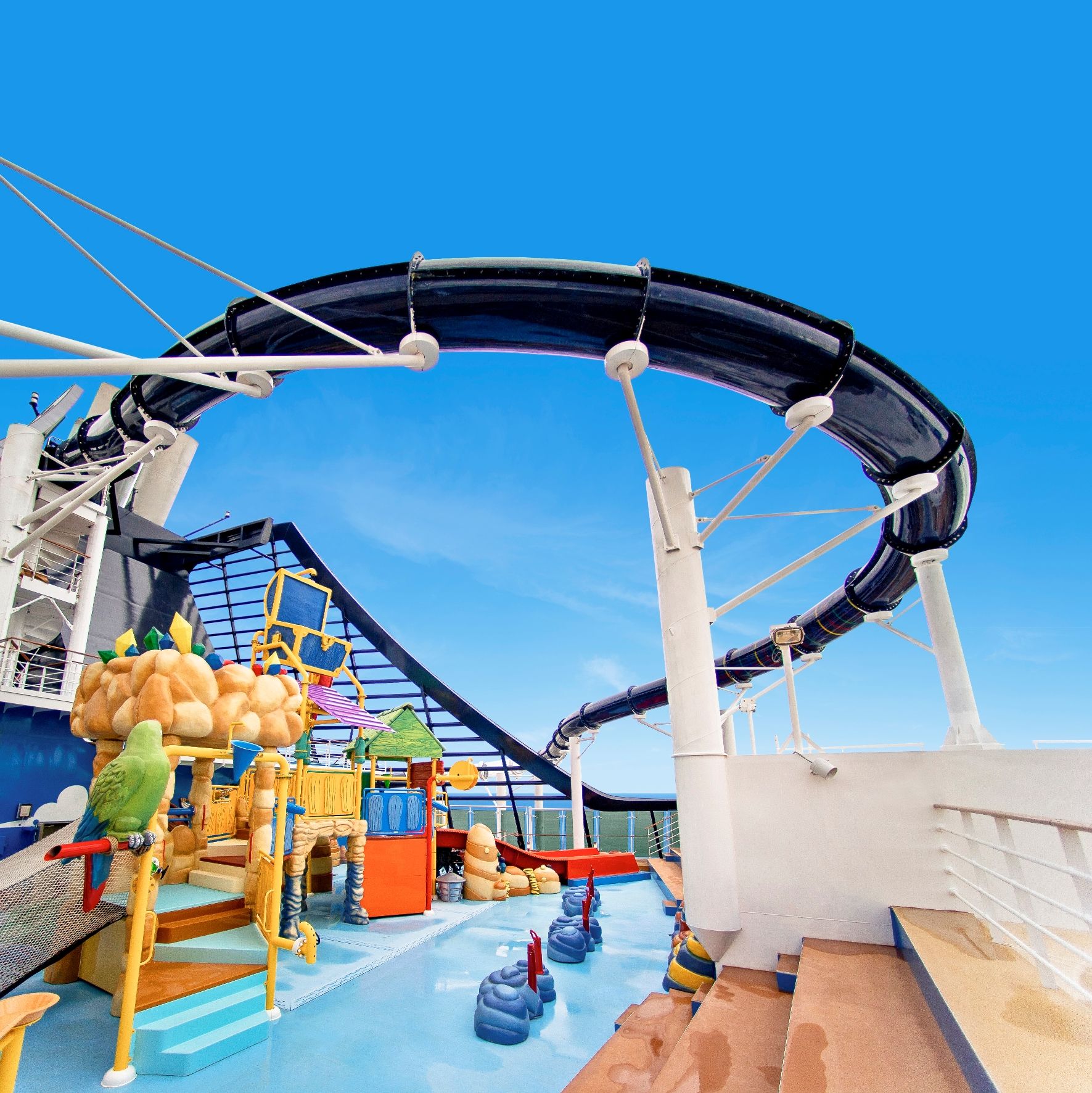 4 басейна, 12 джакузи, 120 метрова водна пързалка, плажна зона с шезлонги на откритата палуба.