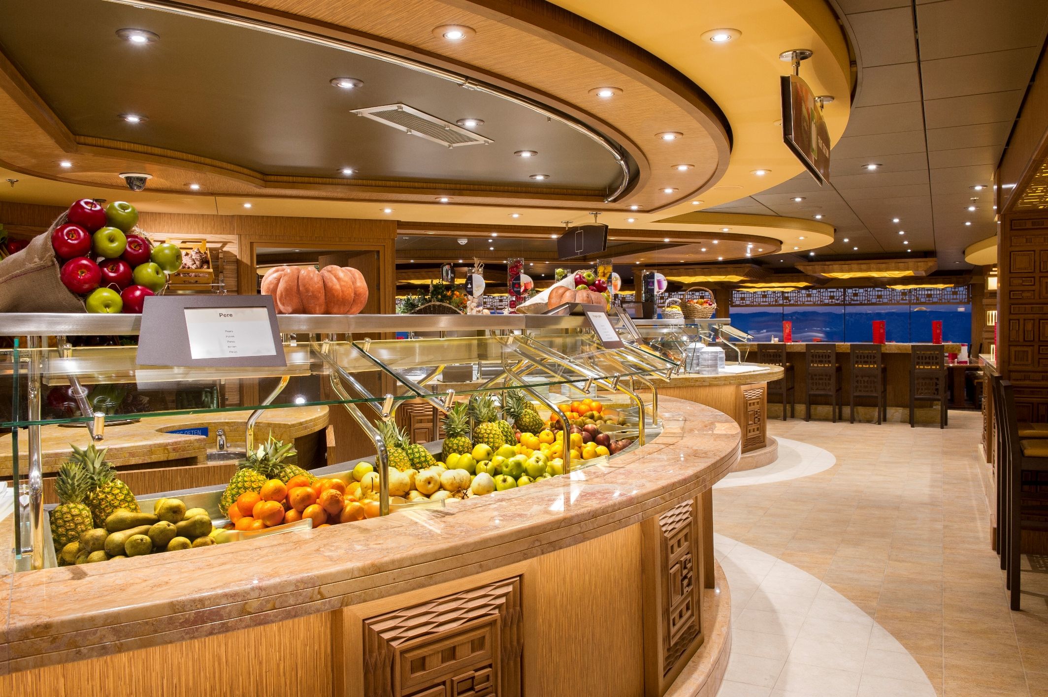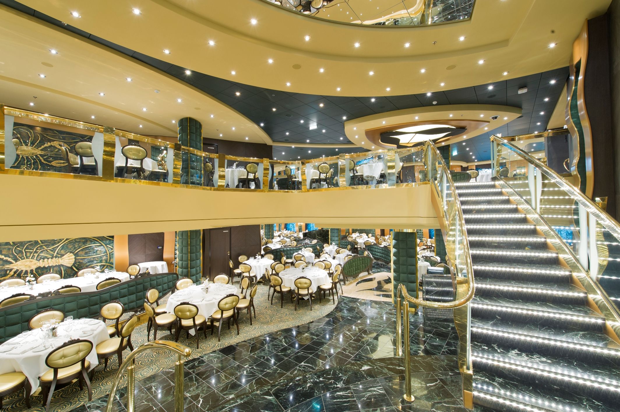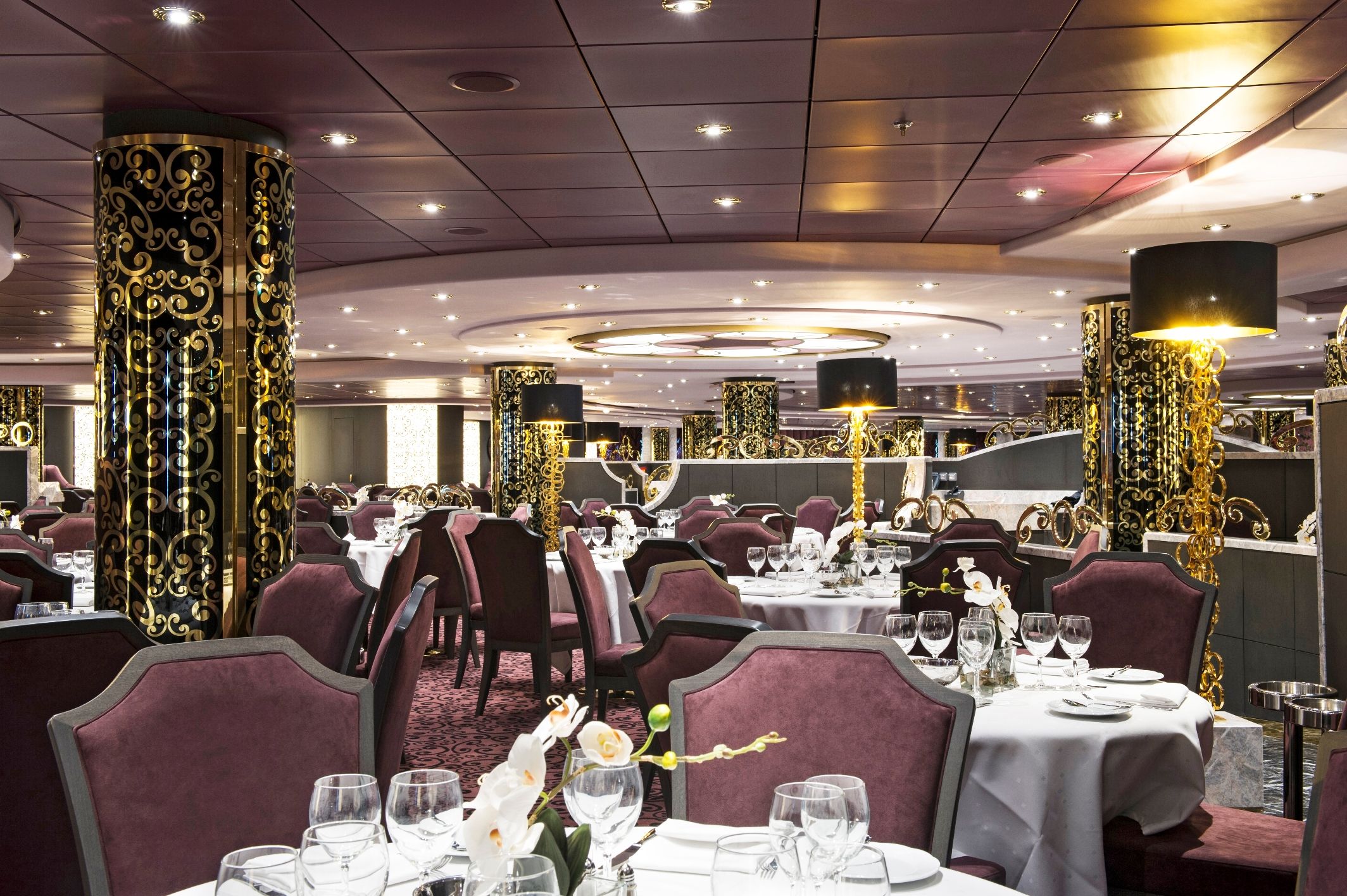 2 основни ресторанта, 2 бюфет ресторанта, Butcher`s cut – американски стек хаус, суши ресторант, 9 бара на закрито и 3 на откритите палуби, дискотека.