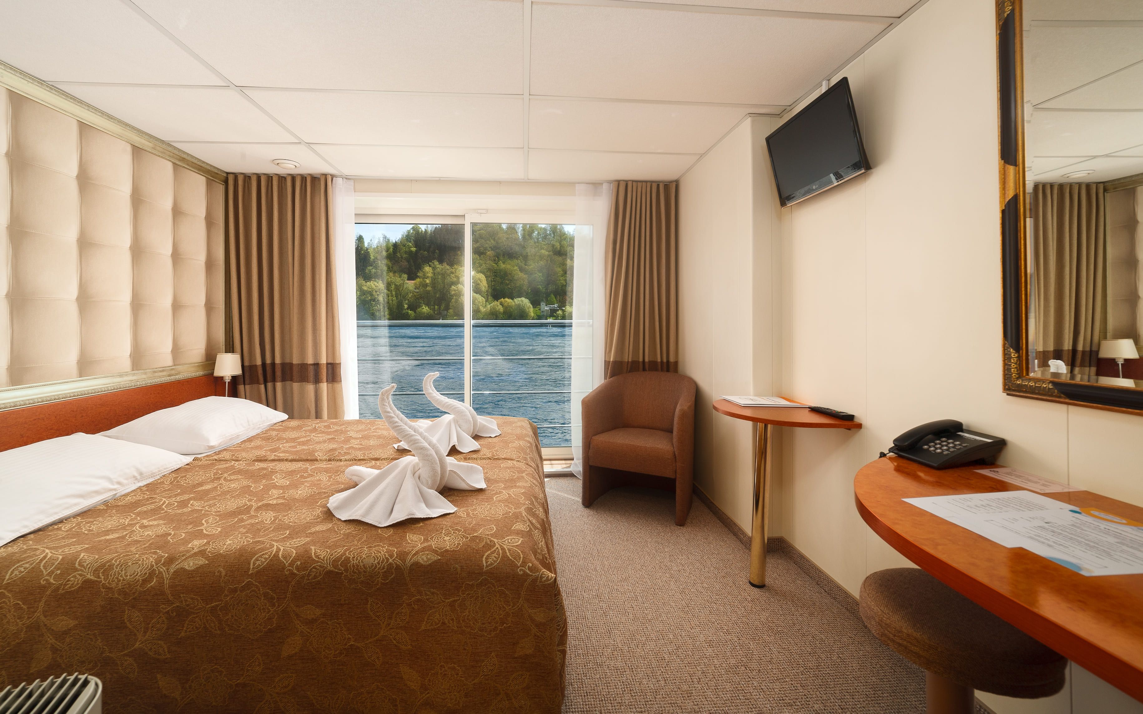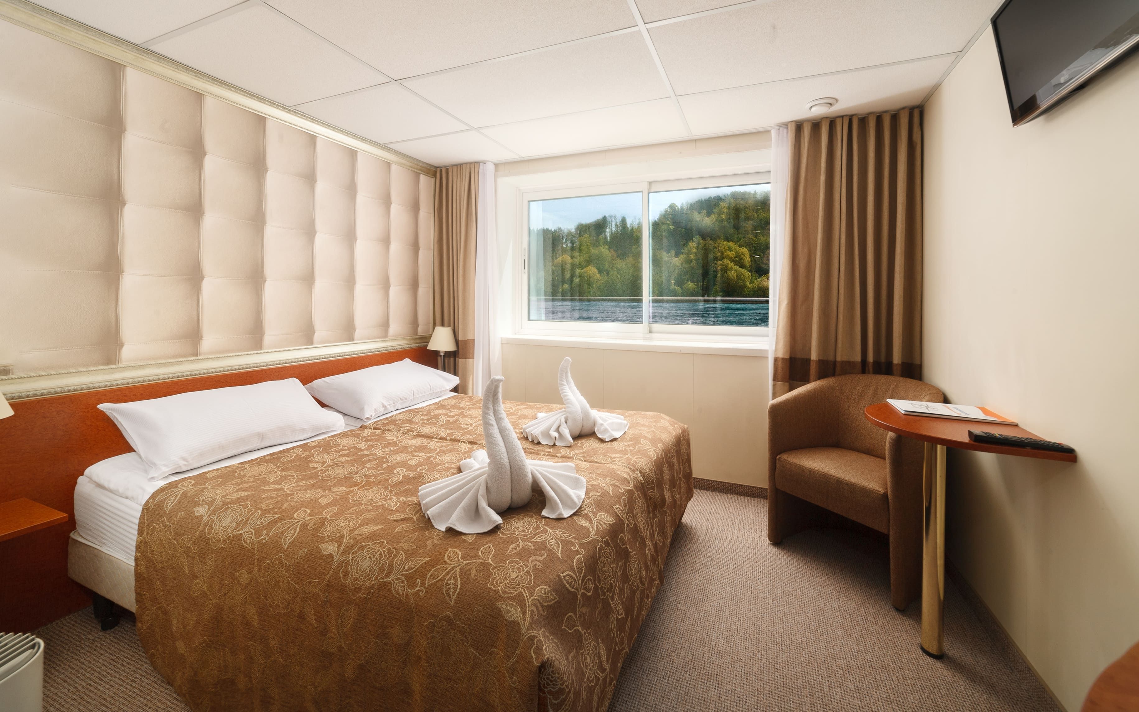 Каютите са разположени на 3 палуби, като на основна палуба разполагат с илюминатори, които не се отварят, на средна с отваряеми прозорци и на горна с големи френски прозорци, които също се отварят. Всички каюти имат индивидуален климатик, сателитна ТВ, сешоар, баня и тоалетна. Площта им е около 14 кв. м.