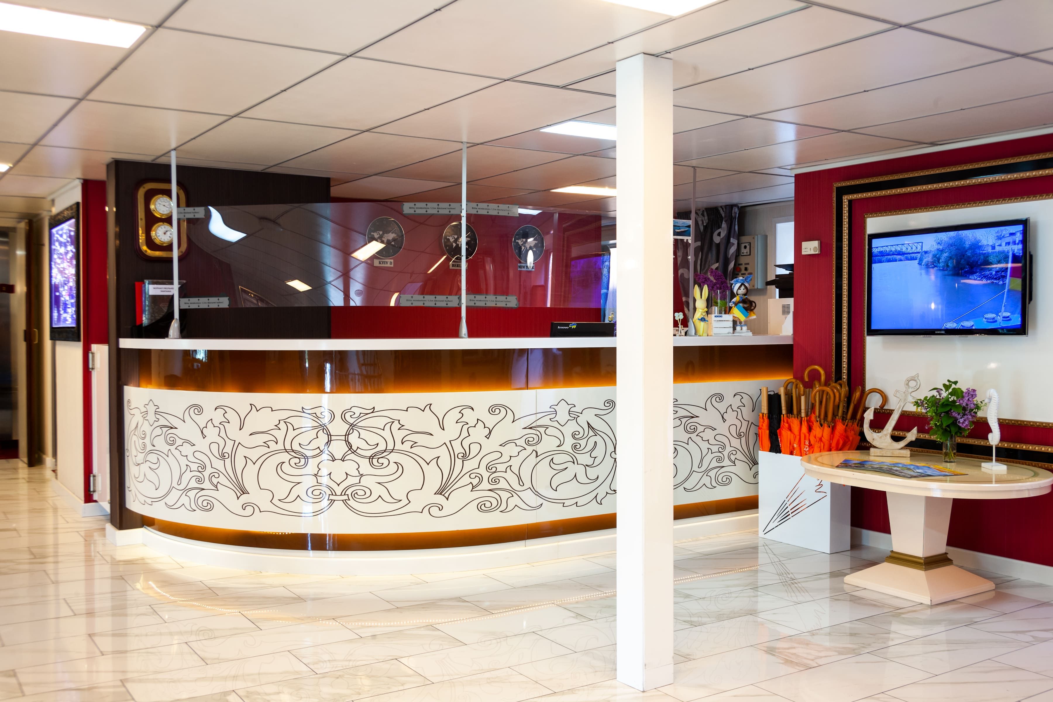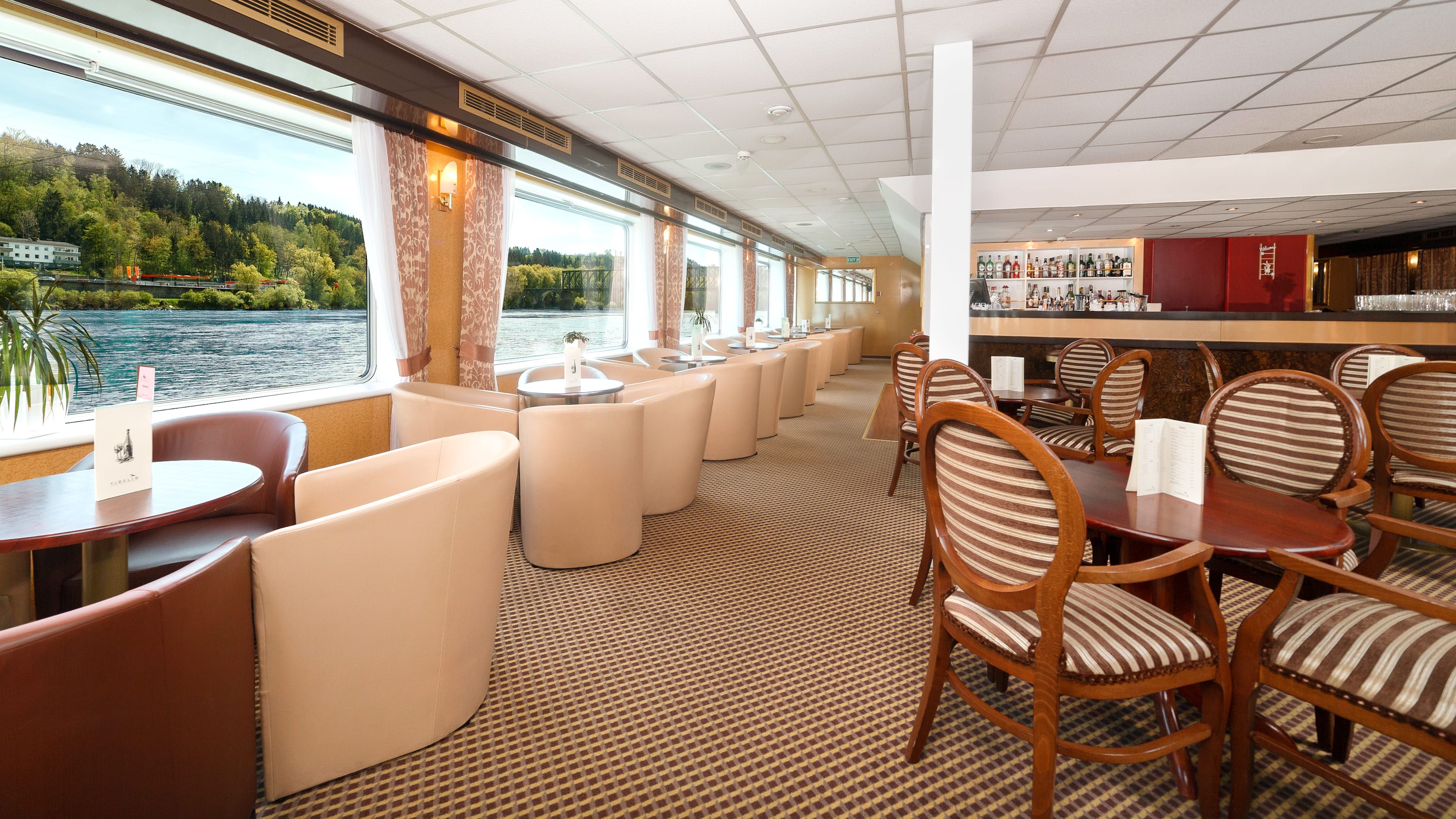 На борда ще откриете, ресторант, панорамен бар, слънчева палуба с шезлонги и басейн, малък фитнес и сауна.