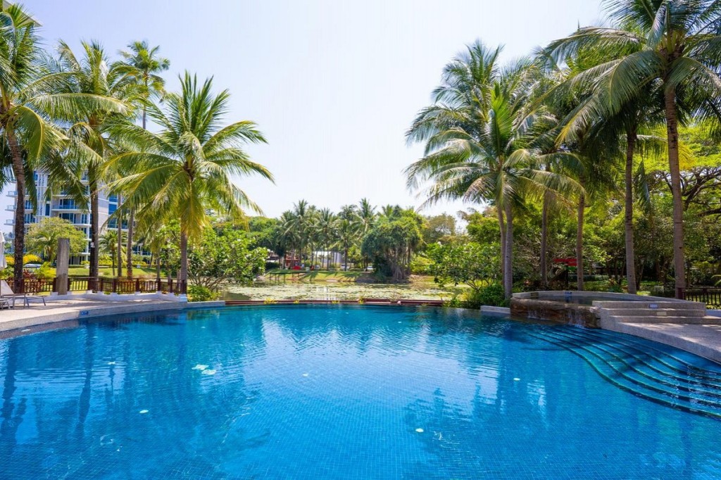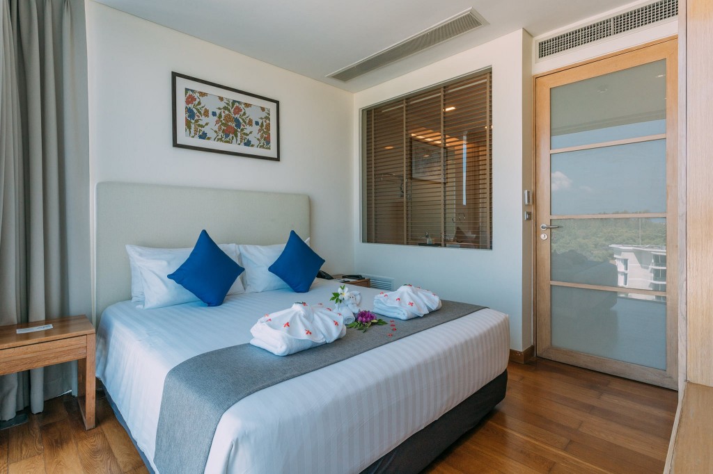 1 Bedroom Residence with Balcony with Kitchen – 92 м2, изглед към градината. Този просторен суит разполага с една всекидневна и кухненски бокс, една отделна спалня ( с 1 легло ) и една баня с душ кабина. Стаята разполага с климатик, плоскоекранен телевизор с кабелни канали, минибар, безплатни тоалетни принадлежности и кърпи, сет за приготвяне на кафе и чай, сейф.