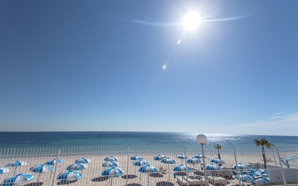 Собствен, пясъчен. Чадъри и шезлонги на плажа и басейна - безплатно, матраци - срещу заплащане. Плажни кърпи не се предлагат.