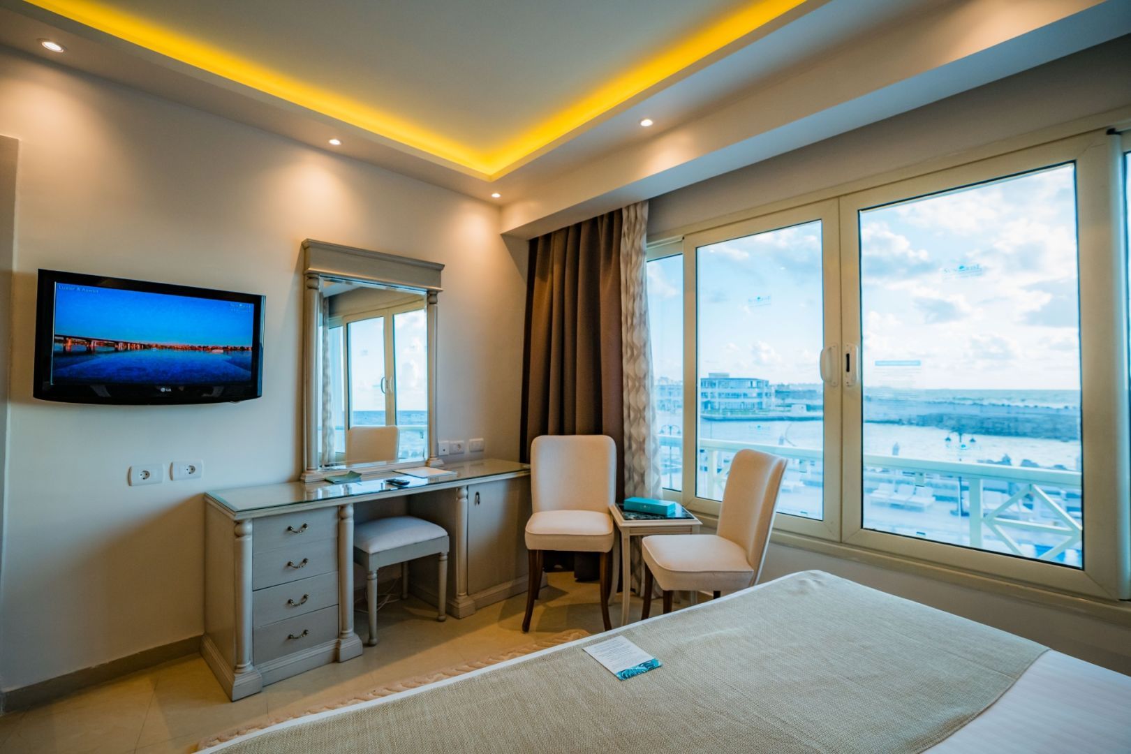 - Делукс стая с морски изглед: приблизително 28 м2, морски изглед, стая с двойно легло king-size или две единични легла, баня с вана, прозорец/тераса/балкон, сателитна телевизия, телефон, сейф (размер за лаптоп), климатик, минибар, удобства за приготвяне на кафе и чай, сешоар, кантар (при поискване), ютия и дъска за гладене (при поискване), адаптери, щепсели и USB портове