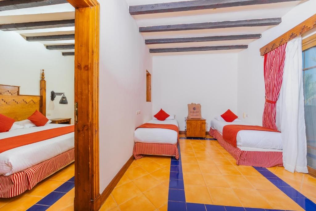 Family Room - Акцентите на семейната стая са две спални, свързани чрез врати. Стаите разполагат с двойно легло king size или две единични легла. Други удобства: балкон или тераса с изглед към градината, басейна или морето, баня с вана и душ, сешоар, климатик, сейф, телефон, сателитна телевизия, минибар. Капацитет: макс. 3 възрастни или 2 възрастни и 3 деца.