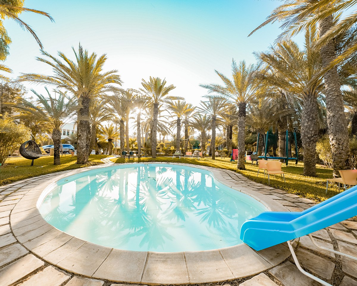 Намира се на 24 км от летище Джерба, на 5 км от центъра на Мидун, на 2 км от голф игрището, на брега на морето. Хотелът е построен през 1968 год., последна реновация - през 2014 год.