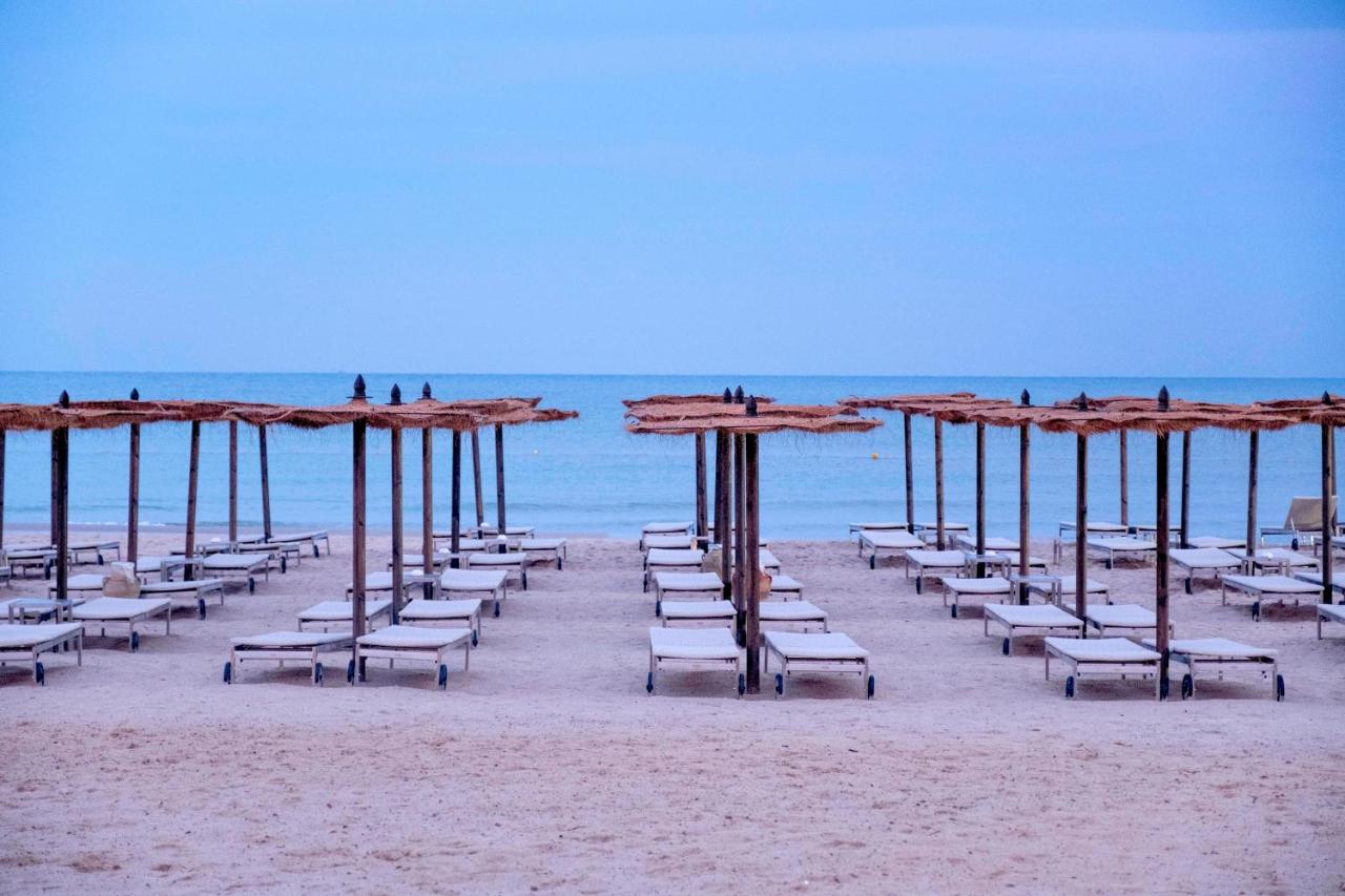 Собствен, пясъчен. Чадъри, шезлонги, матраци и плажни кърпи на плажа и при басейна - безплатно. Сервират се плодове, вода, сокове, алкохолни напитки (при запитване).