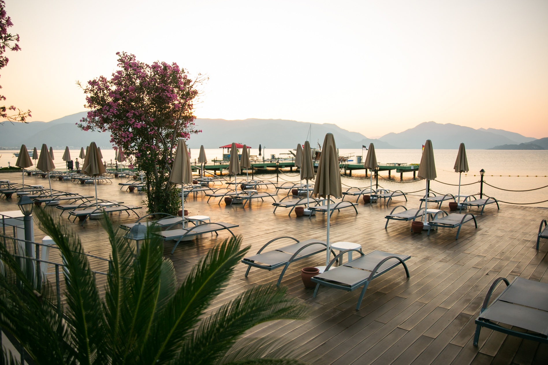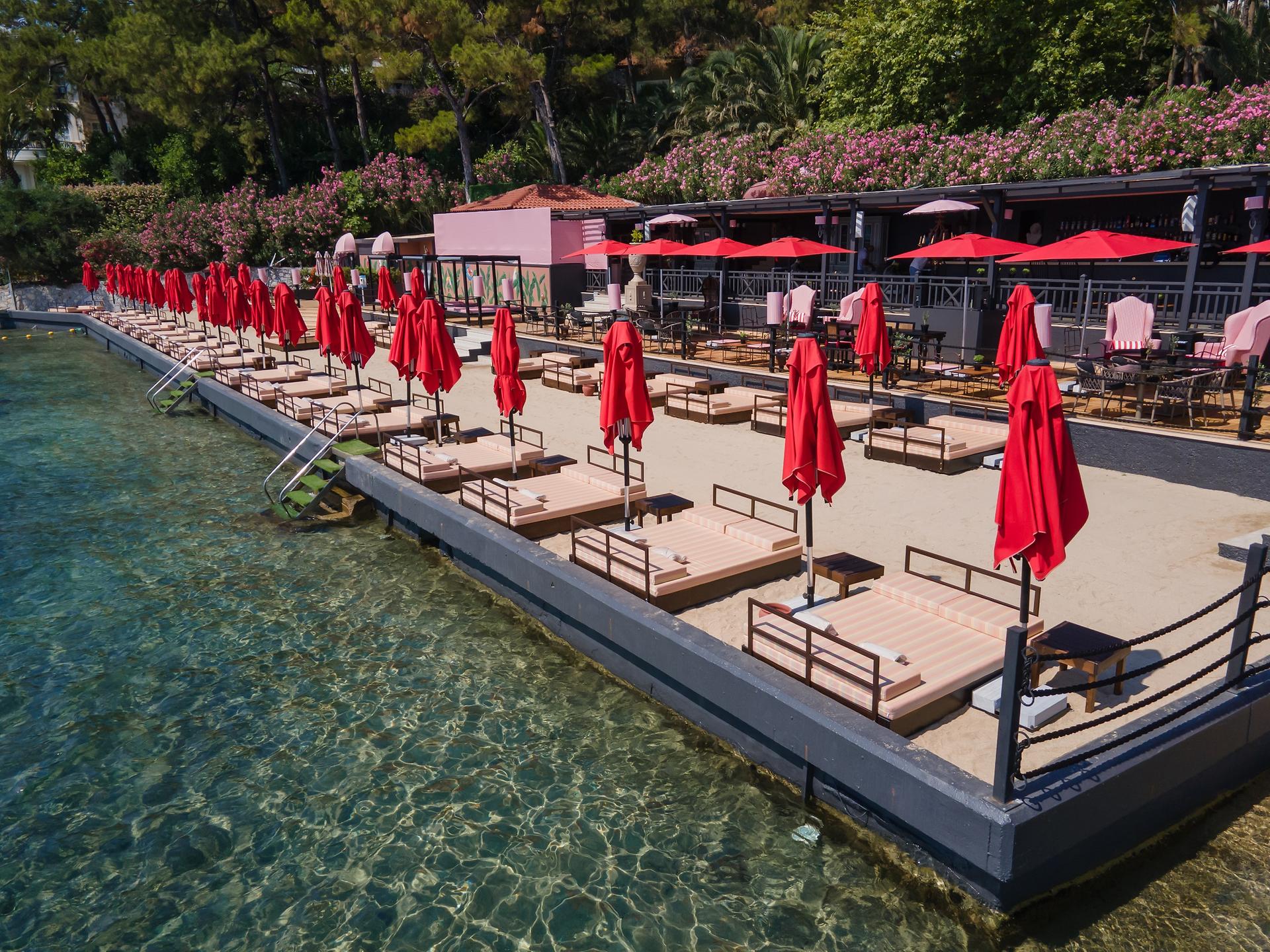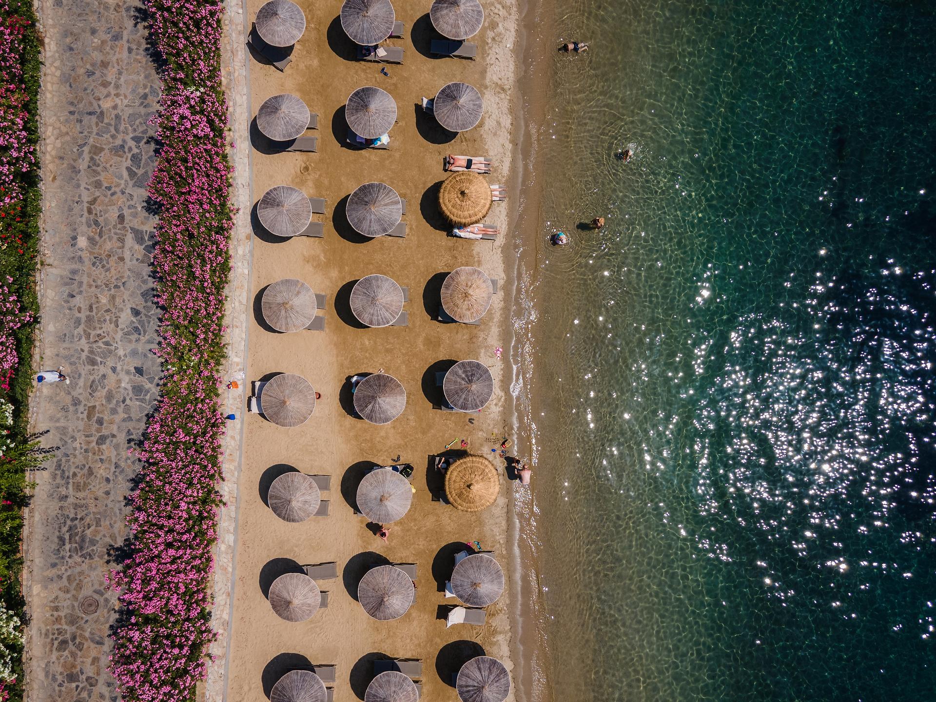 Собствен, пясъчен, 2 платформи – чадъри и шезлонги на плажа и при басейна – безплатно, плажни кърпи – срещу депозит.