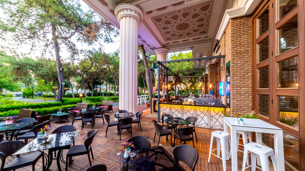 Основен ресторант, бюфет за здравословно хранене (ще работи в периода от 01.06.2026 до 30.09.2026, в блок Б), 5 а-ла-карт ресторанта (стек хаус, италиански ресторант, китайски ресторант, японски, рибен - срещу заплащане, кебап хаус - безплатен), 5 бара, сладкарница, 3 открити и 1 закрит басейн, магазини, СПА център, конферентни зали, паркинг.