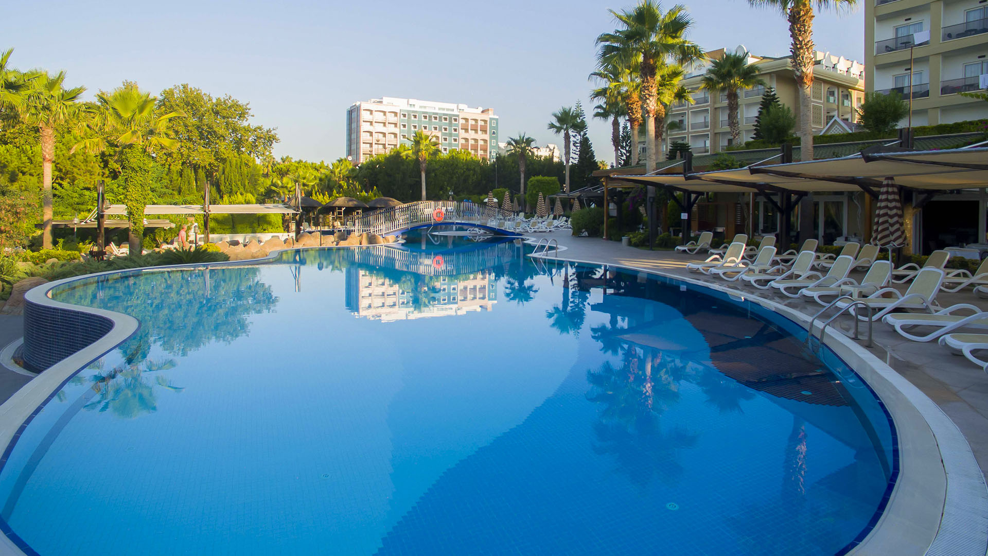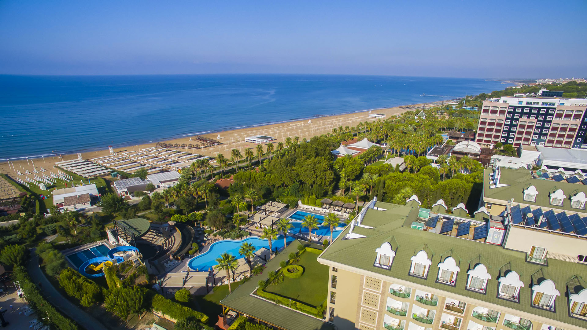 Основен ресторант, а ла карт ресторанти(турски и стек), 5 бара, дискотека, 3 открити басейна и 1 закрит басейн (отопляем), 3 водни пързалки, Спа център, 2 конферентни зали, магазини, пералня, фризьорски салон, лекар на повикване.Безплатни услуги: турска баня, сауна, фитнес, лека анимация, гала вечер (веднъж на 25 седмици), дискотека, степ, аеробика, плажен волейбол, водна гимнастика, тенис на маса, дартс, мини библиотека, WI-FI (на лоби). Платени услуги: масажи, водни видове спорт, игрални автомати, билярд, боулинг. За децата: детски клуб (за деца от 4 до 12 г.), детски басейн, детска площадка, детска анимация, мини-диско.