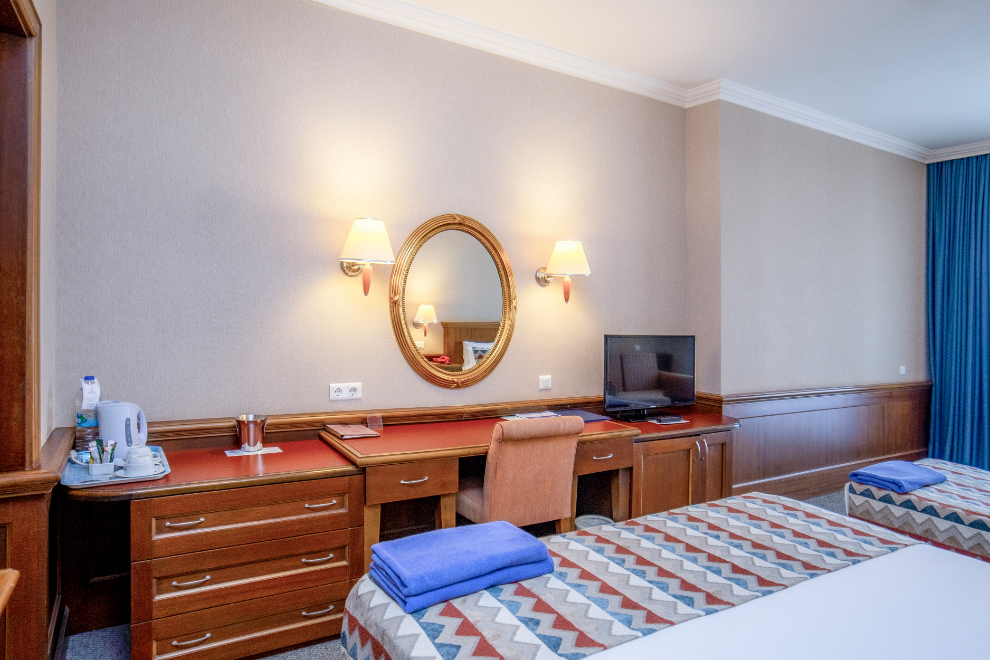 Всички стаи са оборудвани с двойно/две единични или двойно + единично легла, диван, балкон, климатик, телевизор , телефон, баня с душ/вана, сешоар, сет за кафе/чай, минибар (вода, безалкохолни напитки , бира – безплатно), сейф (срещу депозит).