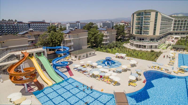 Основен ресторант, 3 Ала Карт ресторанта (турски, рибен, барбекю - с предварителбно записване, за 1 седмичен престой се полага 1 посещение - безплатно), 6 бара, 2 открити и 2 закрити басейна, 1 конферентна зала, SPA център, магазини, фризьорски салон. За децата: детски басейн, мини клуб, анимация, детска площадка. Безплатни услуги: сауна, турска баня, плажен волейбол, тенис на корт, тенис на маса, баскетбол, боулинг, безжичен интернет (на lobby). Платени услуги: масаж, игрални автомати, лекар, водни спортове. Плаж: Собствен - пясъчен. Чадъри, шезлонги и матраци на плажа и басейна - безплатно.