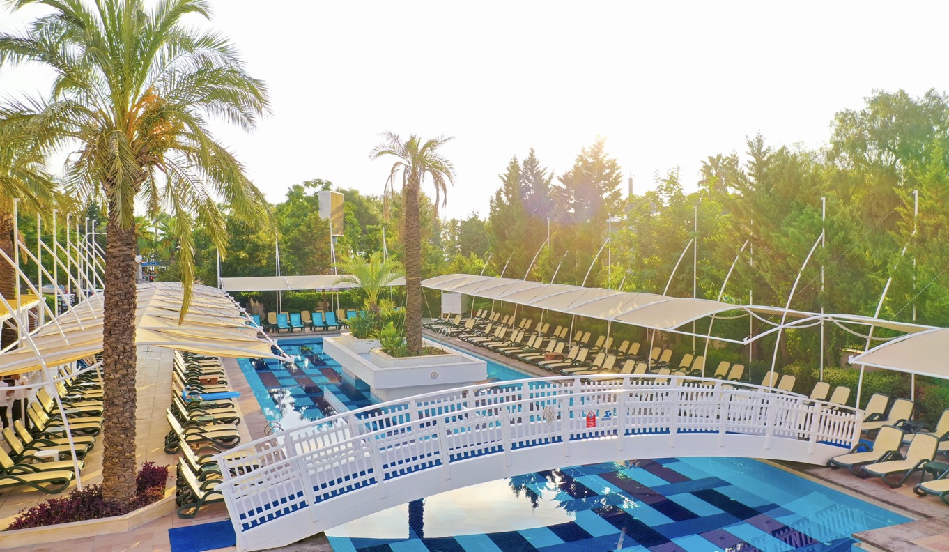 Основен ресторант, а - ла - карт ресторант (с предварителна резервация), 4 бара, 3 открити и 2 закрити басейна, водни пързалки, магазини, СПА център, дискотека, кино, конферентни зали, паркинг. За децата: Детска площадка, мини клуб (4-12 г.), 2 детски басейна – външен и вътрешен, водни пързалки, анимация. Безплатни услуги: Турска баня, сауна, джакузи, фитнес, дартс, тенис на маса, тенис корт (с предварителна резервация), баскетбол, аеробика, водна гимнастика, кино, жива музика, анимация, интернет. Платени услуги: Масаж, фризьор, търговски център, билярд, боулинг, джаги, интернет кафе (с предварителна резервация), видеоигри, химическо чистене, лекар, водни спортове, наем на топки и ракети за тенис, осветление за тенис корта.