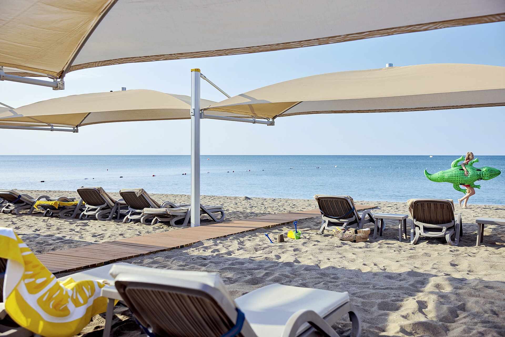 Собствен, пясъчен, с дължина на плажната ивица 250 м. и кей 400 м2. Чадъри, шезлонги и матраци на плажа и при басейна - безплатно. Плажни кърпи – безплатно.