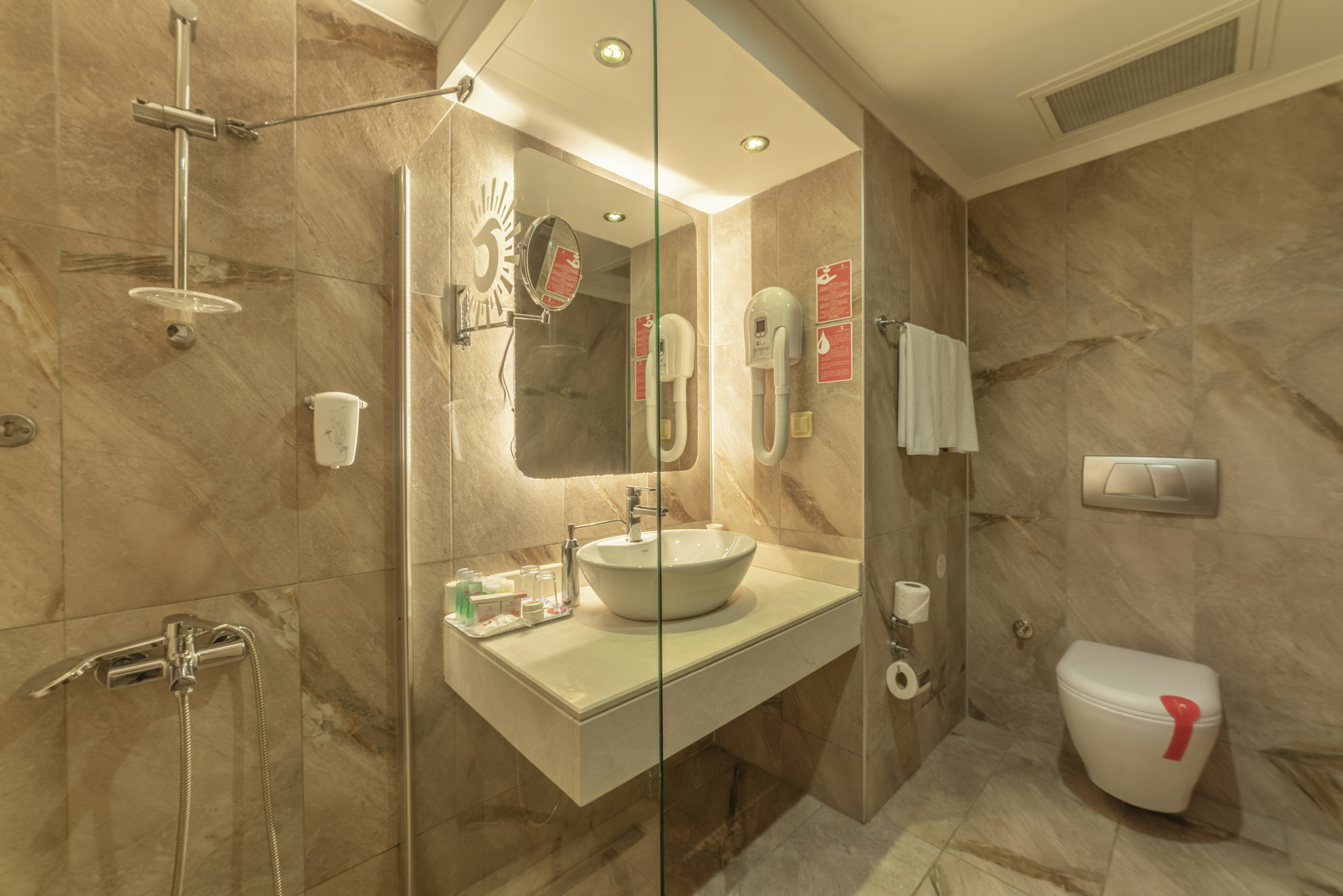 Всички стаи са оборудвани с климатик, телевизор, телефон, баня с душ, сешоар, минибар, сейф, балкон, Wi-Fi. Почистване на стаите и смяна на кърпите - всеки ден, смяна на спално бельо – 3 пъти в седмицата.