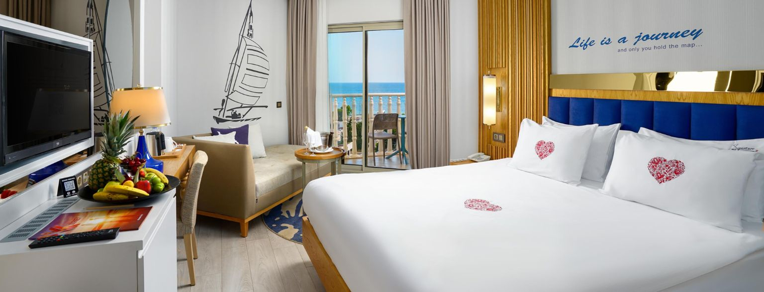 Хотелът разполага с общо 436 стаи, от които: 356 Standard room (двойно и допълнително легло, или две единични с допълнително легло, изглед суша или море – 28 м2), 6 Jacuzzi Terrace Standard (двойно и допълнително легло, тераса с джакузи, изглед суша, басейн или море – 28 м2), 54 Family room (две спални, двойно и две единични легла, 1 баня, изглед суша, басейн или море – 38 м2), 16 Jacuzzi Terrace Family room (две спални, двойно и две единични легла, 1 баня, тераса с джакузи, изглед суша, басейн или море – 38 м2).