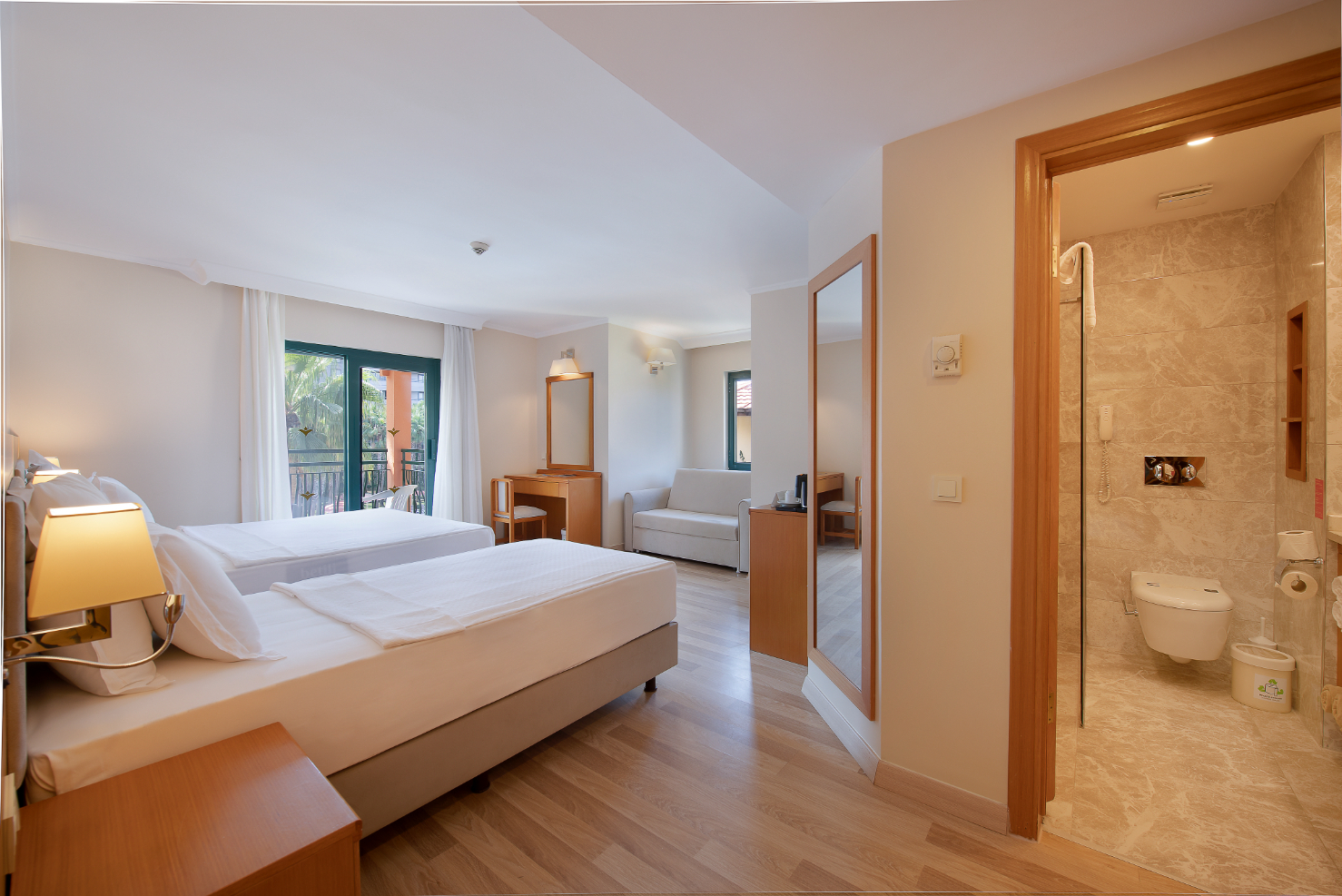 Всички стаи са оборудвани с климатик, телевизор, телефон, баня с душ, сешоар, сет за чай/кафе, минибар (безплатен, зарежда се еднократно при пристигането), сейф (безплатен).