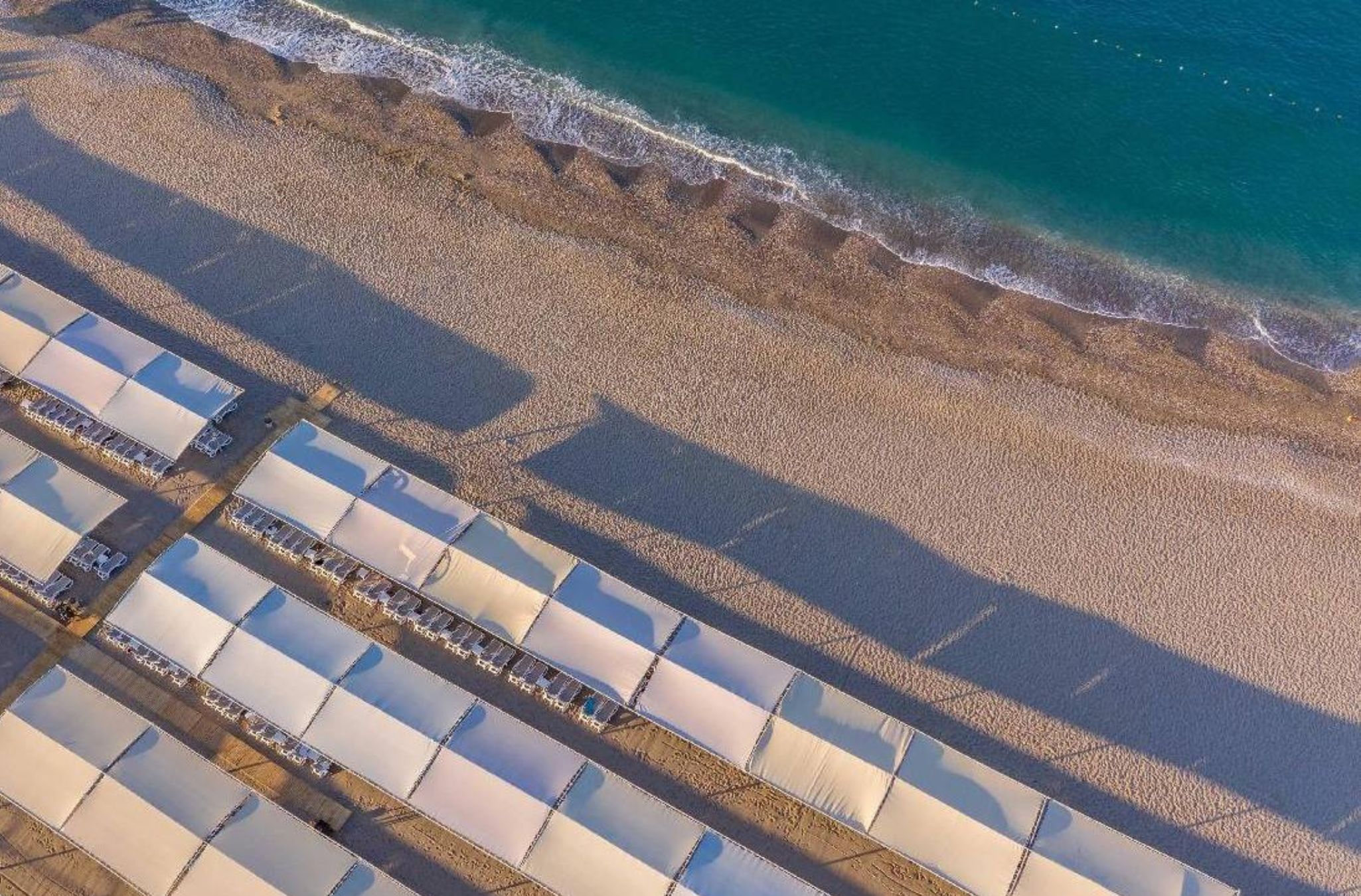 Собствен, пясъчно - чакълест. Чадъри, шезлонги и плажни кърпи на плажа и при басейна – безплатно.