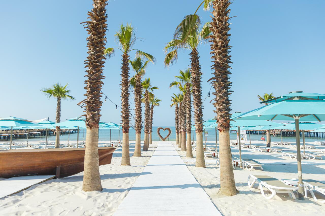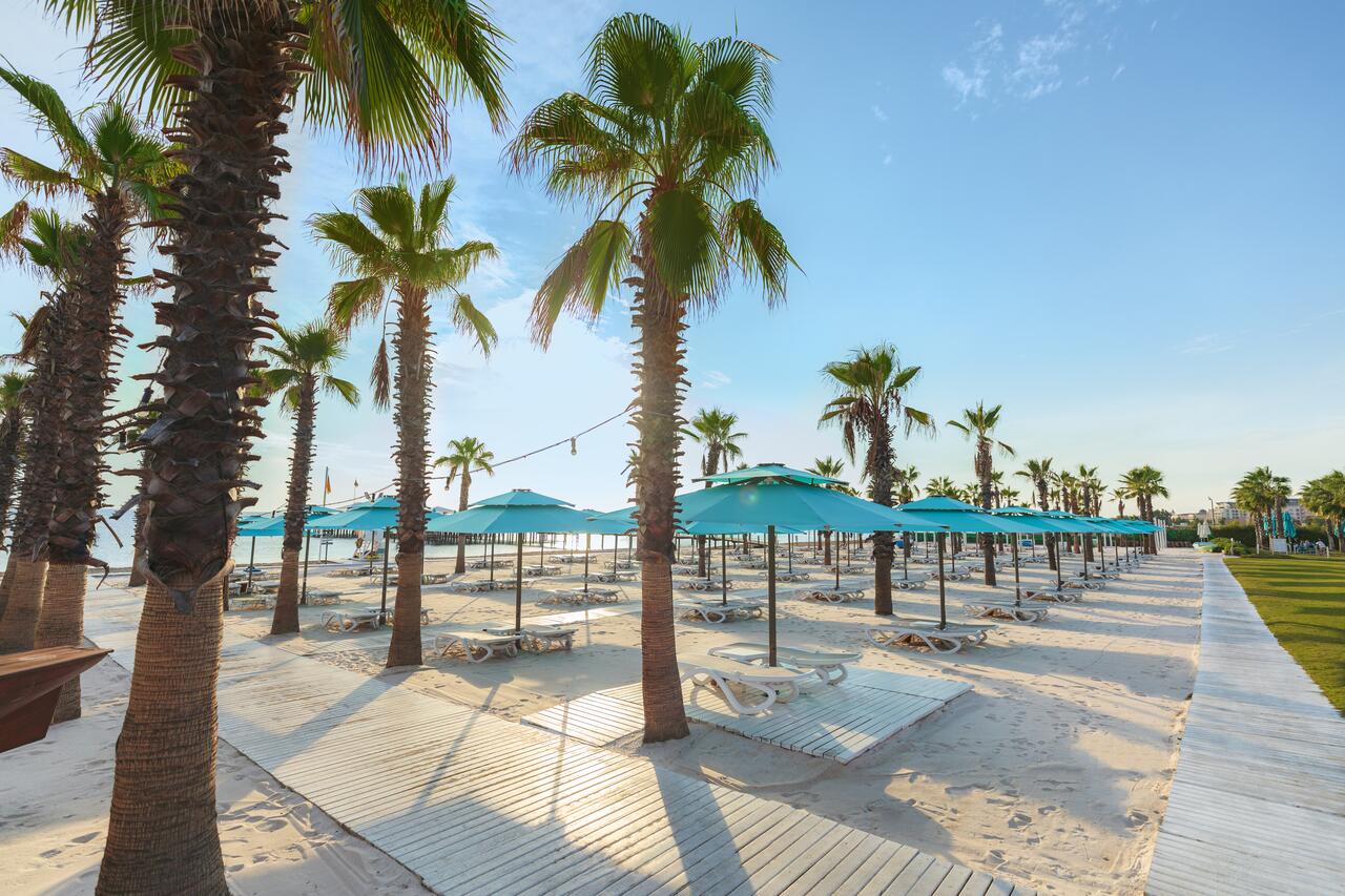 Собствен, пясъчен с дължина 450 м., притежаващ сертификат "Син флаг". Чадъри, шезлонги, матраци и плажни кърпи на плажа и при басейна - безплатно.