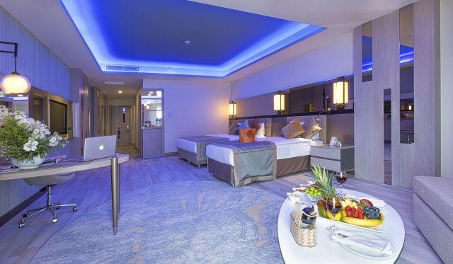 В стаите: Хотелът разполага с общо 793 стаи, от които 606 разположени в 9-етажна основна сграда. Всички стаи са оборудвани с климатик, телевизор, телефон, баня с душ, балкон сешоар, сет за чай/кафе, минибар (безплатен), сейф (безплатен). Почистване на стаите и смяна на кърпите – всеки ден, смяна на спалното бельо – 3 пъти в седмицата. 634 Superior Standard room (с изглед градина или море - 64 м2), 8 Superior Standard Disabled room (с изглед градина - стаи за инвалиди - 64 м2), 87 Family Duplex room (разположени на 2 етажа, 2 спални, 2 бани - 120 м2), 48 Family Room with connection door (с изглед градина или море - 2 спални, коридор, 1 баня - 80 м2), 8 Junior Suite (с изглед море - 1 спалня, хол, 1 баня, 1 джакузи - 140 м2), 8 Deluxe Suite (с изглед градина или басейн - 1 спалня, хол, коридор, 1 баня, 1 джакузи - 140 м2).
