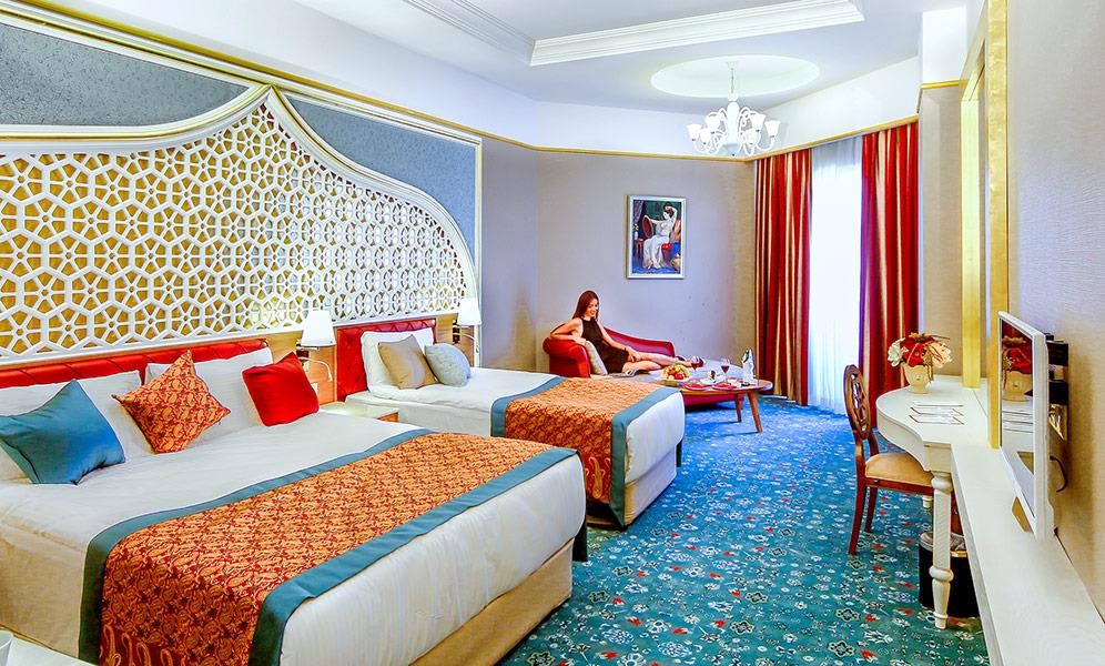 В стаите: Хотелът разполага с общо 450 стаи, от които 356 стандартни стаи и 68 фамилни стаи. Всички стаи са оборудвани с: климатик, сателитна телевизия, телефон, баня с вана, сешоар, минибар - зарежда се един път в деня с вода и бира - безплатно, сейф (безплатно), балкон. Почистване на стаите и смяна на кърпите – всеки ден, смяна на бельото – 2 пъти в седмицата.