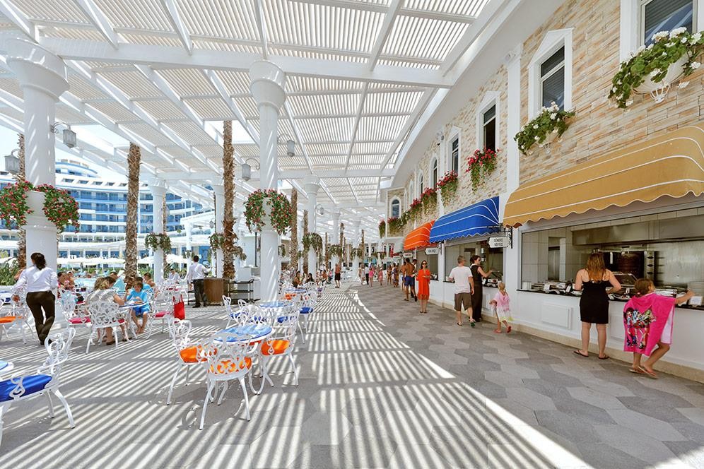 На територията на хотела: Основният ресторант, 6 A'la Carte ресторанти (азиатски, мексикански, италиански, турски, рибни и барбекю - с резервация), 13 бара, Cafe Turk, сладкарница, дискотека, снек ресторанти, 3 открити басейна, закрит басейн (отопляем), Аквапарк, Спа център, конгресен център, фризьорски салон, лекарски кабинет, магазини.