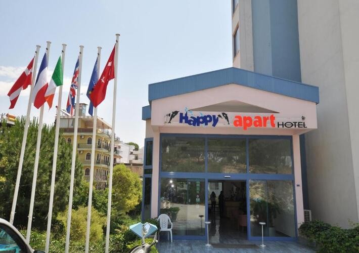 Happy Apart Hotel е семеен комплекс, реновиран през 2015 г. Предлага настаняване с възможност за самостоятелно готвене и пране. Комплексът е разположен около голям басейн със снек-бар край него. Намира се на тихо място в района на Дамския плаж, само на 250 м от самия плаж. Модерните апартаменти имат голяма дневна зона с отворен план и кухненски бокс и отделна спалня с 2 отделни легла. Облицованите с керамични плочки бани са оборудвани с душ, мивка и тоалетна. Хотелът разполага с тераса за слънчеви бани с LED осветление. За комфорта на гостите са предоставени шезлонги и градински възглавници. Съоръженията на комплекса включват плувен басейн с детски сектор, обширни градини и минимаркет.