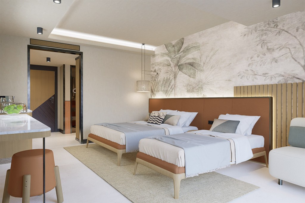 Family Room – 35 m2, 2 спални (1 двойно + 3 единични легла) Балкон, баня (душ-тоалетна), изглед: към градина/земя или басейна.