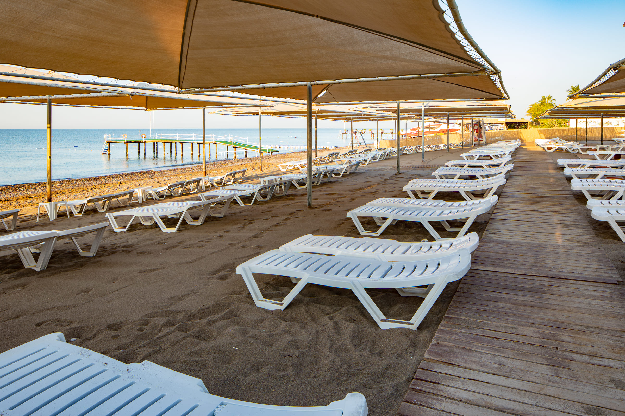 Собствен, пясъчно - чакълест. Чадъри, шезлонги и плажни кърпи на плажа и при басейна – безплатно.