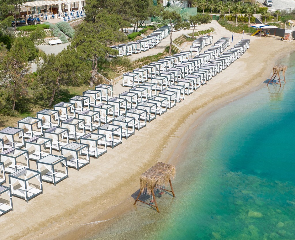 La Blanche Island се намира в уединен и много красив район на крайбрежието на Гюверджинлик с обща площ от 82 000 m². Включва собствена пясъчна ивица от общо 1200 м, и aква парк. Летище Милас Бодрум е на 15 км. Пред хотела има спирка за градски транспорт. Реновация през 2023/4 г на ресторантите, общите части и подобрена Ultra All Inclusive концепция.