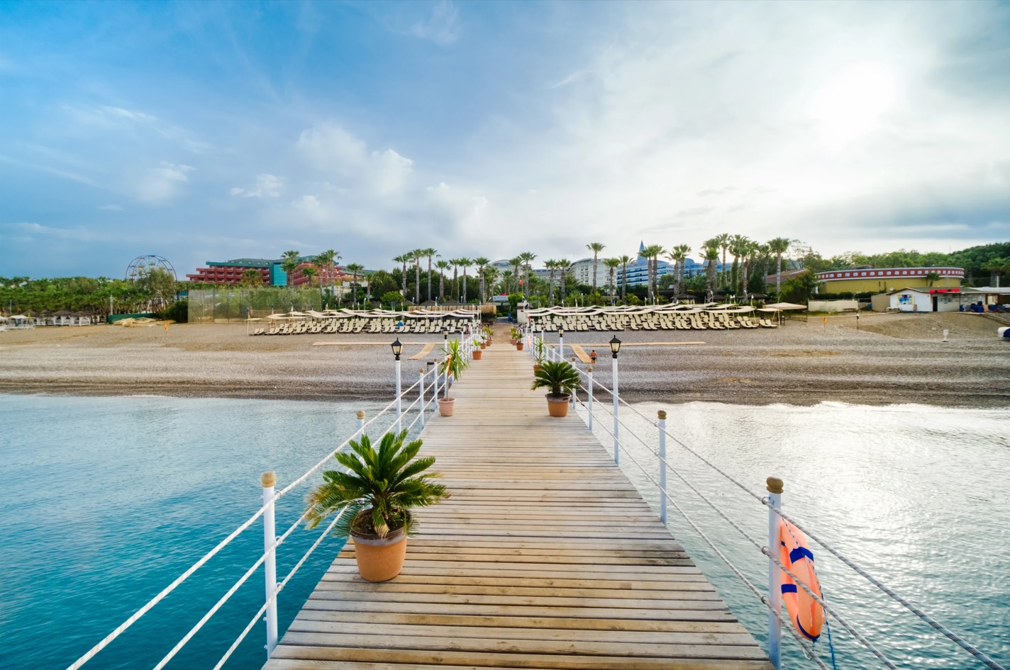 Собствен, пясъчно-чакълест, кей. Чадъри, шезлонги и плажни кърпи на плажа и при басейна – безплатно.
