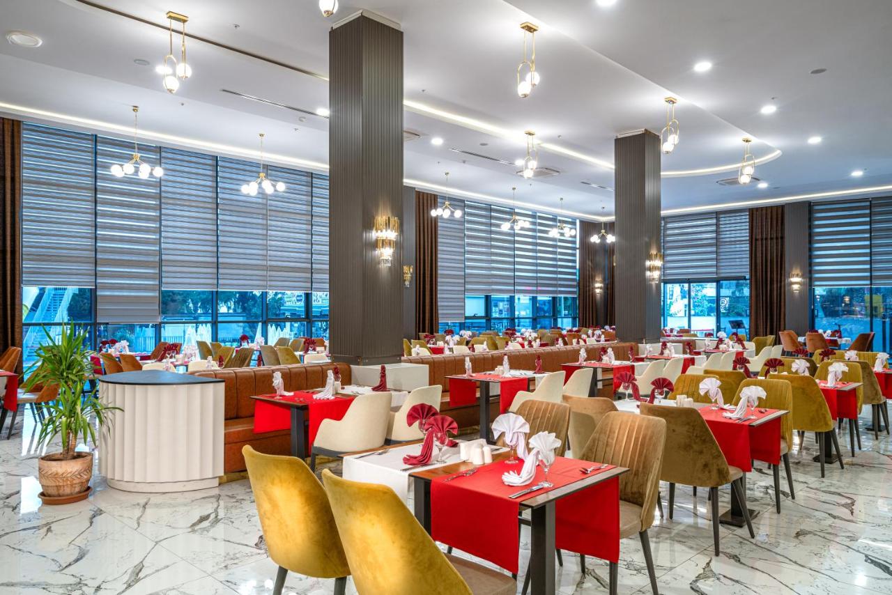 Основен ресторант, а-ла-карт ресторант – интернационален (1 безплатно посещение минимум 7 нощувки), сладкарница, 3 бара, открит и закрит басейн, водни пързалки, СПА център.